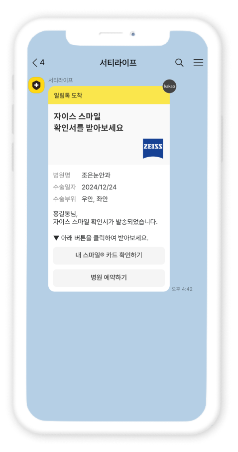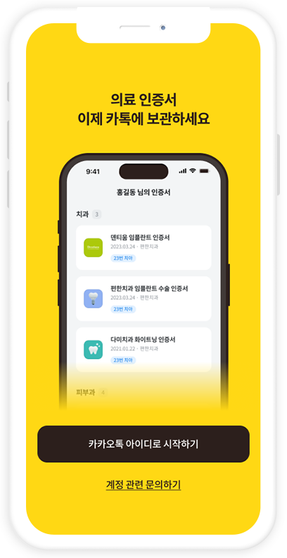 누구나 간편하게 카카오 알림톡을 통해 자신의 의료 인증서를 저장하고 관리할 수 있습니다.