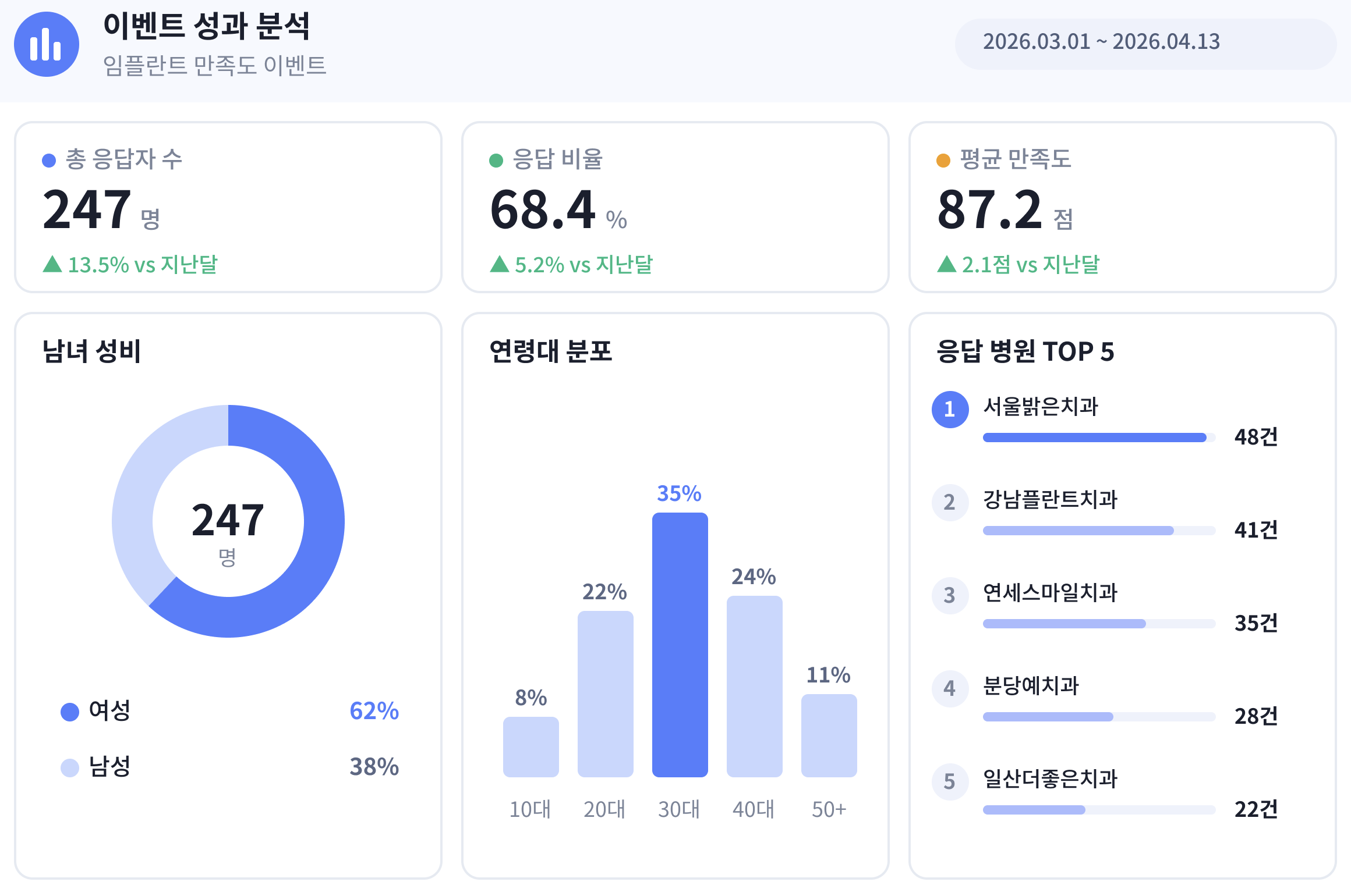 만족도 조사 이벤트로 환자 피드백을 체계적으로 수집하니 서비스 개선 포인트가 명확해졌어요. 재방문율도 자연스럽게 올라갔습니다.